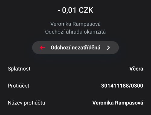 Poslat zprávupřidal skutečné jméno majitele účtu: Veronika Rampasová k bankovnímu účtu: 5130089093/0800