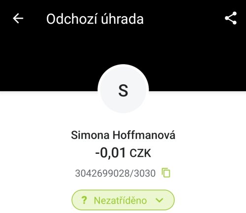 Poslat zprávupřidal skutečné jméno majitele účtu: Simona Hoffmanová k bankovnímu účtu: 3042699028/3030