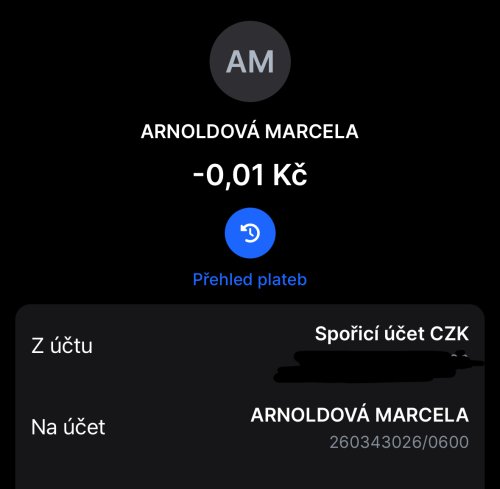 Poslat zprávupřidal skutečné jméno majitele účtu: Marcela Arnoldová k bankovnímu účtu: 260343026/0600
