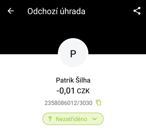 Poslat zprávupřidal skutečné jméno majitele účtu: Patrik Šilha k bankovnímu účtu: 2358086012/3030