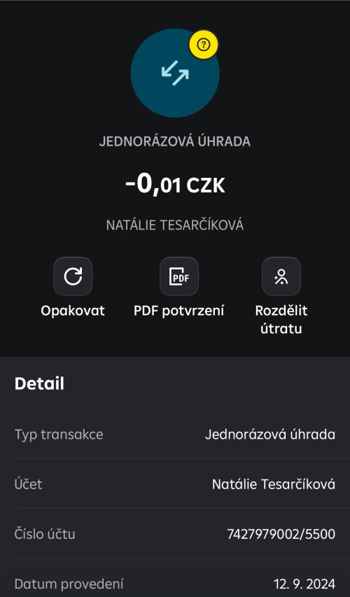 Poslat zprávupřidal skutečné jméno majitele účtu: Natálie Tesarčíková k bankovnímu účtu: 7427979002/5500
