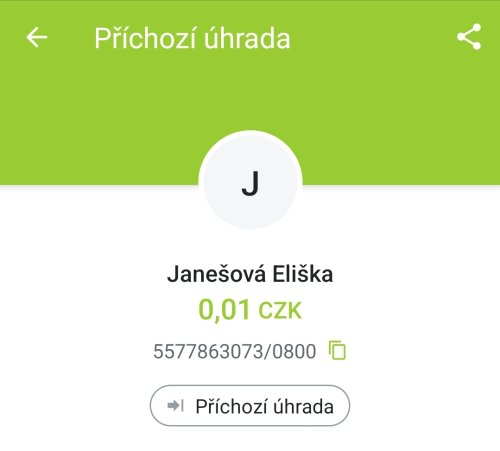 Poslat zprávupřidal skutečné jméno majitele účtu: Eliška Janešová k bankovnímu účtu: 5577863073/0800