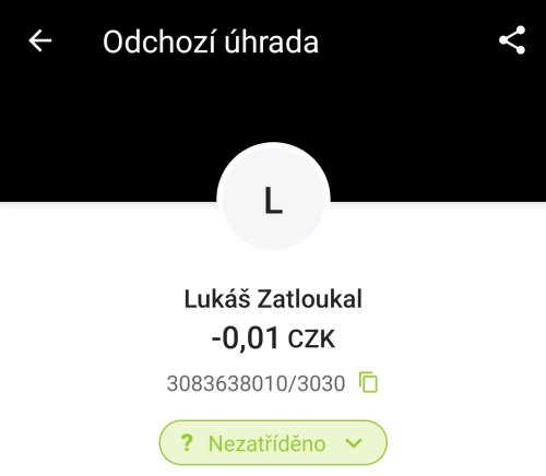 Poslat zprávupřidal skutečné jméno majitele účtu: Lukáš Zatloukal k bankovnímu účtu: 000000-3083638010/3030