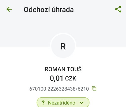 Poslat zprávupřidal/a skutečné jméno majitele účtu: Roman Touš k bankovnímu účtu: 670100-2226328438/6210