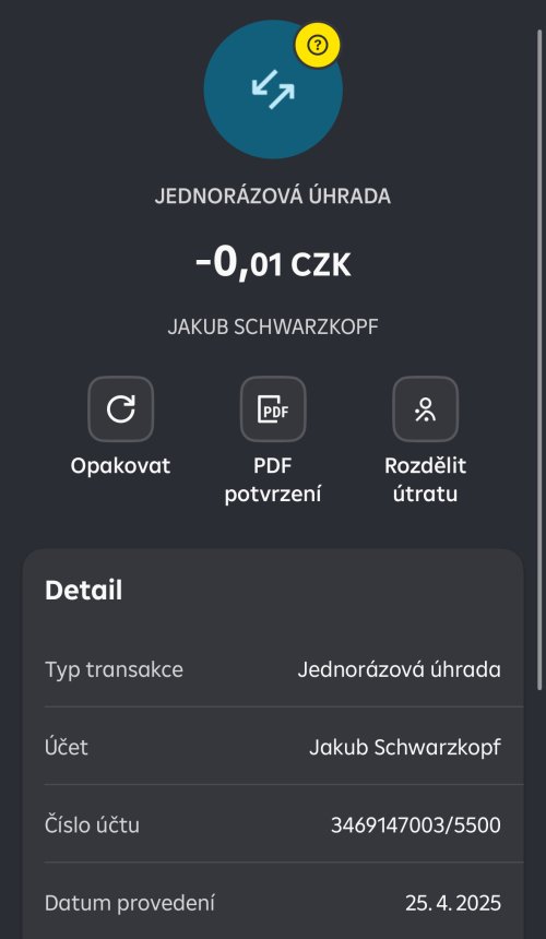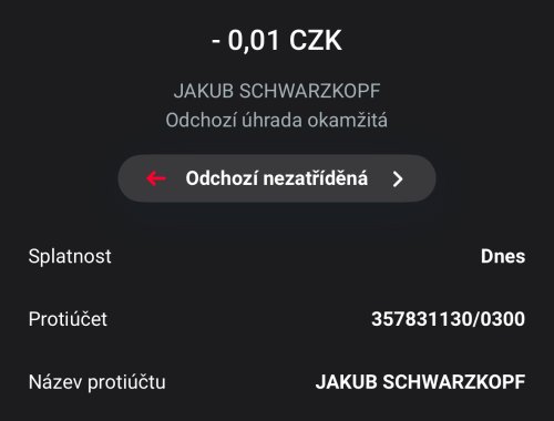 Poslat zprávupřidal skutečné jméno majitele účtu: Jakub Schwarzkopf k bankovnímu účtu: 3469147003/5500