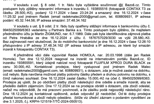Dne 12. 12. 2024 jsem reagoval na inzerát zveřejněný na internetovém bazaru Bazos.cz (ID inzerátu: