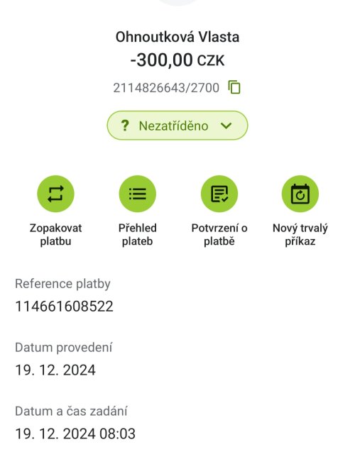 | 09. 01. 2025 | Online přes portál | 2114826643/2700 | 300,- | - |