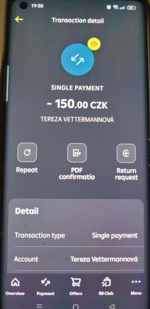 Poslat zprávupřidal skutečné jméno majitele účtu: Tereza Vettermannova k bankovnímu účtu: 9489122003/5500