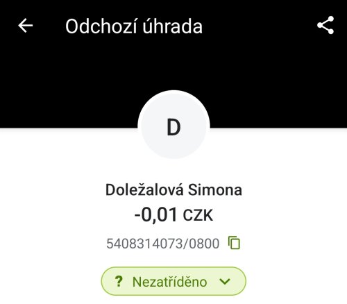 Poslat zprávupřidal skutečné jméno majitele účtu: Simona Doležalová k bankovnímu účtu: 5408314073/0800