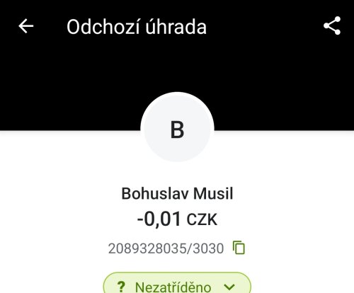 Poslat zprávupřidal skutečné jméno majitele účtu: Bohuslav Musil k bankovnímu účtu: 2089328035/3030