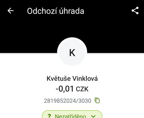 Poslat zprávupřidal skutečné jméno majitele účtu: Květuše Vinklová k bankovnímu účtu: 2819852024/3030