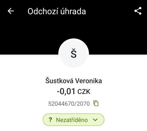 Poslat zprávupřidal/a skutečné jméno majitele účtu: Veronika Šustková k bankovnímu účtu: 52044670/2070