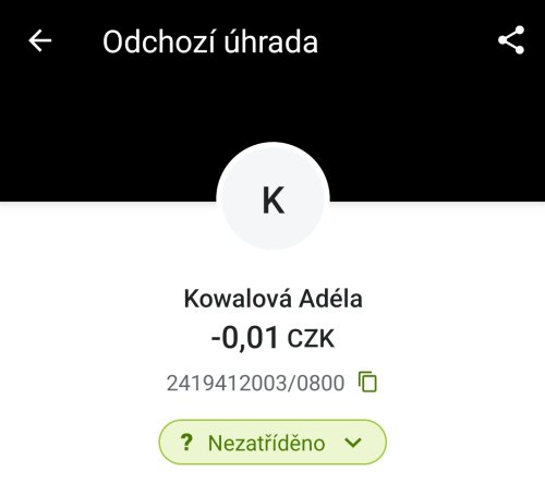Poslat zprávupřidal/a skutečné jméno majitele účtu: Adéla Kowalová k bankovnímu účtu: 2419412003/0800
