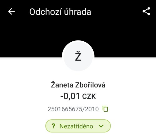 Poslat zprávupřidal/a skutečné jméno majitele účtu: Žaneta Zbořilová k bankovnímu účtu: 2501665675/2010
