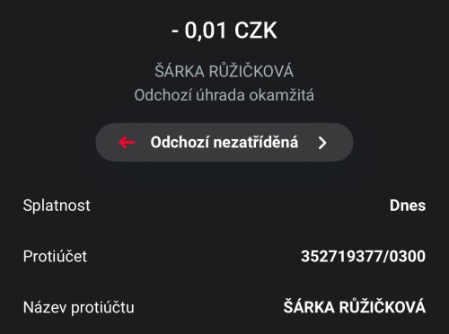 Poslat zprávupřidal/a skutečné jméno majitele účtu: Šárka Růžičková k bankovnímu účtu: 000000-0352719377/0300