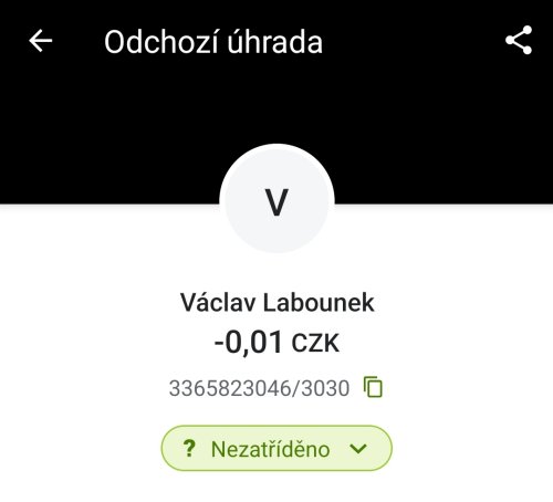 Poslat zprávupřidal/a skutečné jméno majitele účtu: Václav Labounek k bankovnímu účtu: 3365823046/3030
