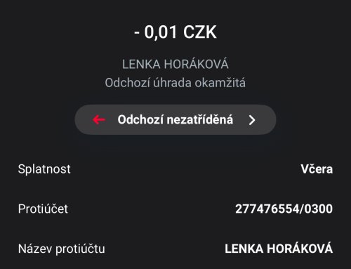 Poslat zprávupřidal/a skutečné jméno majitele účtu: Lenka Horáková k bankovnímu účtu: 277476554/0300