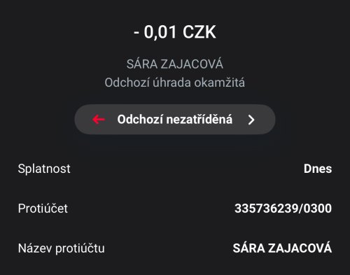 Poslat zprávupřidal/a skutečné jméno majitele účtu: Sára Zajacová k bankovnímu účtu: 335736239/0300