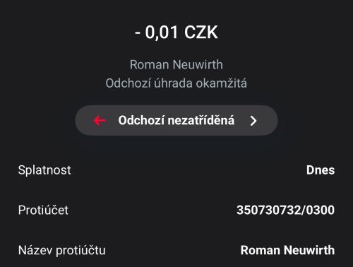 Poslat zprávupřidal/a skutečné jméno majitele účtu: Roman Neuwirth k bankovnímu účtu: 350730732/0300