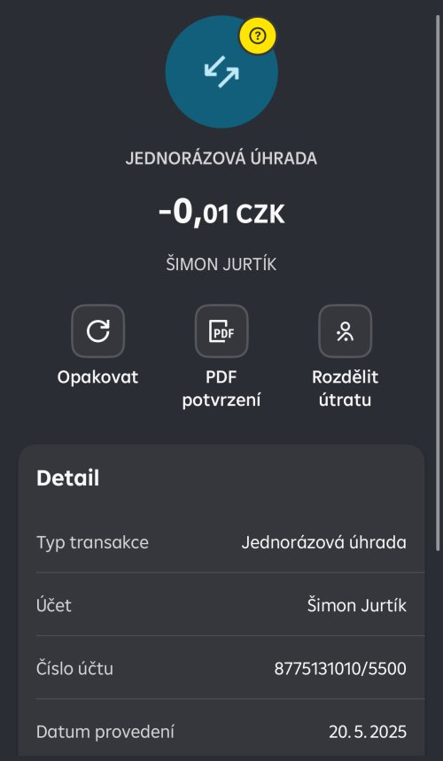Poslat zprávupřidal/a skutečné jméno majitele účtu: Šimon Jurtík k bankovnímu účtu: 8775131010/5500
