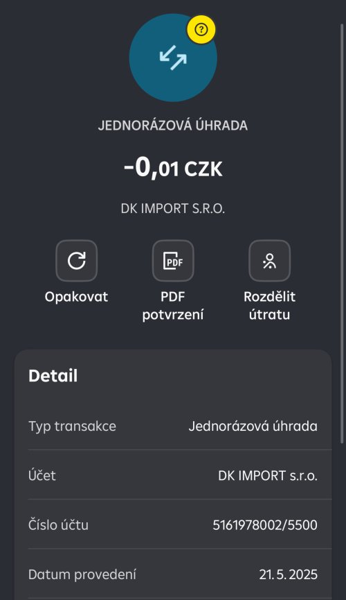 Poslat zprávupřidal/a skutečné jméno majitele účtu: DK Import SRO k bankovnímu účtu: 5161978002/5500