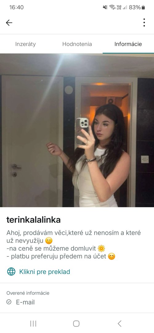 Predavajuca z Vinted, ktora vraj nema vlastny ucet, ucet ma iba jej priatela sestra, meno majitela uctu vraj Dominika Balogova. Na profile mala aj fotku aj ked to ani nemusi byt ona, mlada tmavovlasa zena. Predavala akoze supravu Guess, komunikacia bola v poriadku, az ked jej realne prisli peniaze sa uz neozvala. Na Vinted vystupuje pod menom terinkalalinka. Ak treba, rada poskytnem vsetky screenshoty komunikacie, jej fotku, detail platby. Zistovala som si moznosti aj u oboch bank a u ceskej policie, no ziadost cez banku o moznost vratenia penazi sa mi neoplati riesit kvoli vyske poplatku.