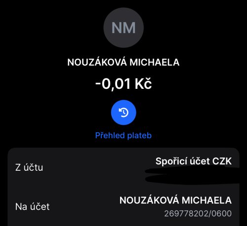 Poslat zprávupřidal/a skutečné jméno majitele účtu: Michaela Nouzáková k bankovnímu účtu: 269778202/0600