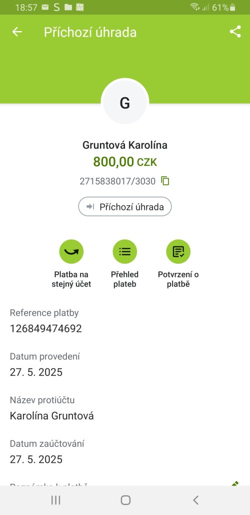 Poslat zprávupřidal/a skutečné jméno majitele účtu: Karolína Gruntová k bankovnímu účtu: 2715838017/3030