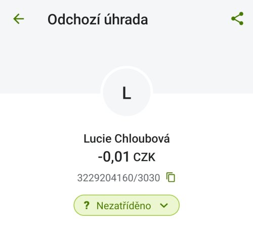 Poslat zprávupřidal/a skutečné jméno majitele účtu: Lucie Chloubová k bankovnímu účtu: 3229204160/3030