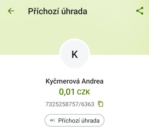 Poslat zprávupřidal/a skutečné jméno majitele účtu: Andrea Kyčmerová k bankovnímu účtu: 7325258757/6363
