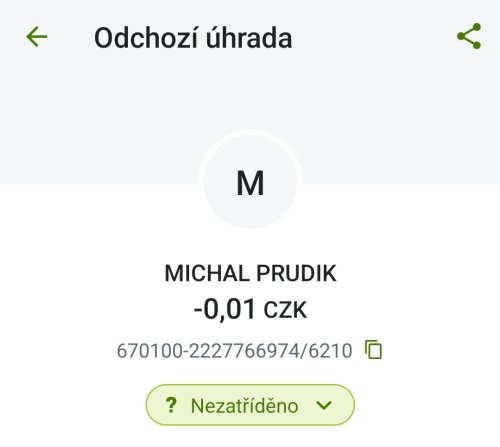 Poslat zprávupřidal/a skutečné jméno majitele účtu: Michal Prudik k bankovnímu účtu: 670100-2227766974/6210