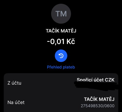 Poslat zprávupřidal/a skutečné jméno majitele účtu: Matěj Tačík k bankovnímu účtu: 275498530/0600