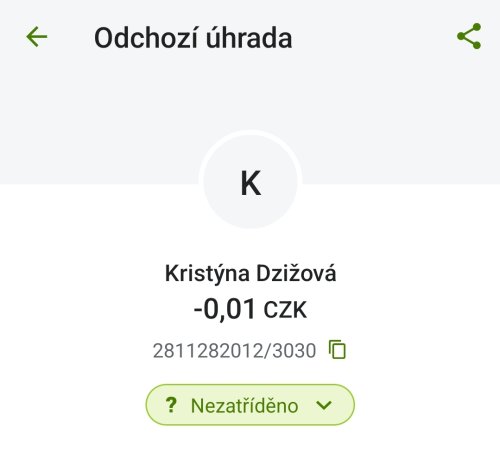Poslat zprávupřidal/a skutečné jméno majitele účtu: Kristýna Dzižová k bankovnímu účtu: 2811282012/3030