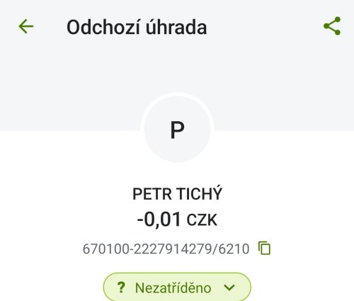 Poslat zprávupřidal/a skutečné jméno majitele účtu: Petr Tichý k bankovnímu účtu: 670100-2227914279/6210