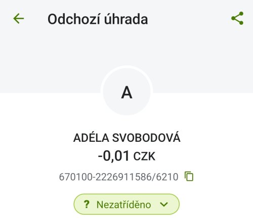 Poslat zprávupřidal/a skutečné jméno majitele účtu: Adéla Svobodová k bankovnímu účtu: 670100-2226911586/6210