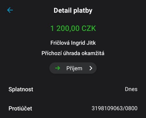 Poslat zprávupřidal/a skutečné jméno majitele účtu: Ingrid Jitka Fryčová k bankovnímu účtu: 3198109063/0800