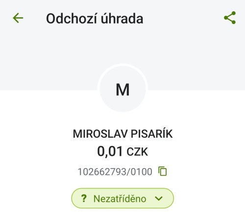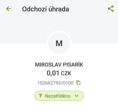 Poslat zprávupřidal/a skutečné jméno majitele účtu: Miroslav Pisarík k bankovnímu účtu: 102662793/0100