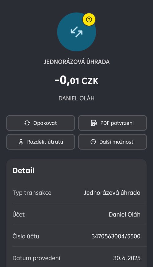 Poslat zprávupřidal/a skutečné jméno majitele účtu: Daniel Oláh k bankovnímu účtu: 3470563004/5500
