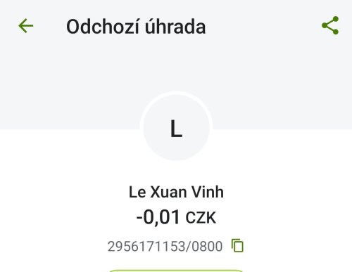 Poslat zprávupřidal/a skutečné jméno majitele účtu: Le Xuan Vinh k bankovnímu účtu: 2956171153/0800