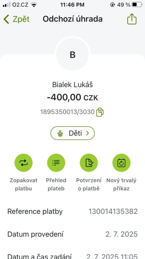 | 08. 07. 2025 | Online přes portál | 1895350013/3030 | 400,- | - |