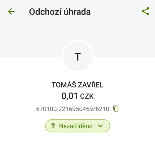 Poslat zprávupřidal/a skutečné jméno majitele účtu: Tomáš Zavřel k bankovnímu účtu: 670100-2216950469/6210