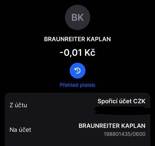 Poslat zprávupřidal/a skutečné jméno majitele účtu: Braunreiter Kaplan k bankovnímu účtu: 198801435/0600