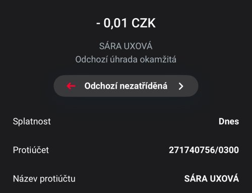 Poslat zprávupřidal/a skutečné jméno majitele účtu: Sára Uxová k bankovnímu účtu: 271740756/0300