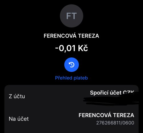 Poslat zprávupřidal/a skutečné jméno majitele účtu: Tereza Ferencová k bankovnímu účtu: 276266811/0600
