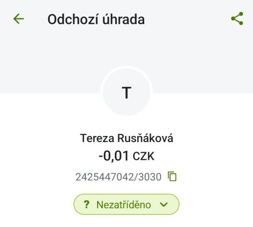 Poslat zprávupřidal/a skutečné jméno majitele účtu: Tereza Rusňáková k bankovnímu účtu: 2425447042/3030