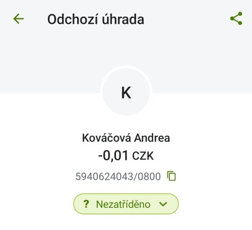 Poslat zprávupřidal/a skutečné jméno majitele účtu: Andrea Kováčová k bankovnímu účtu: 5940624043/0800