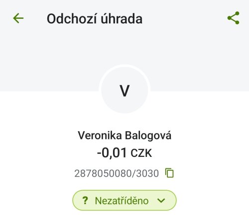 Poslat zprávupřidal/a skutečné jméno majitele účtu: Veronika Balogová k bankovnímu účtu: 2878050080/3030