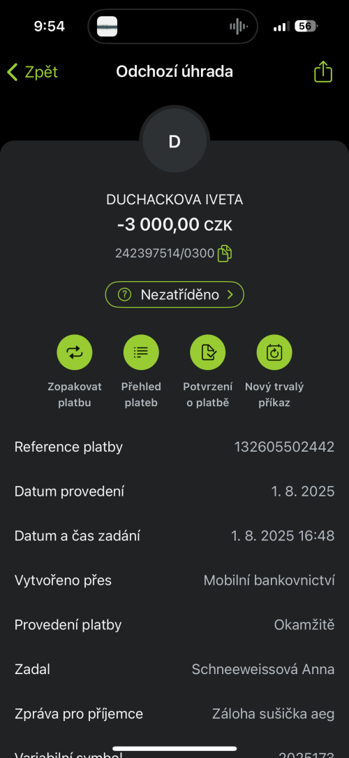 | 09. 09. 2025 | Online přes portál | 242397514/0300 | 3000,- | - |