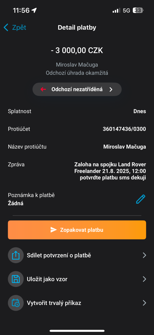 Poslat zprávuByl jsem podveden dnes 2.9. 2025 Taky se prokazoval na autoservis Skukálek z Velkého Šenova. Měl jsem inzerát že koupím RamenaHardRace Audi A3- Zavolal že má zabalené nové originál že mu včera přišli a dnes přijdou další dvě. Domluvili jsme se na půl ceny na účet a zbytek na dobírku. Poslal jsem tedy 8000,- a pán naléhal na to že to svítí červně ta platba a že mi zítra přijde zpátky a že mám ještě dnes poslat 7000,- aby se vyrovnal s DPD. A zítra je balík u mě doma. Bylo mi to podezřelé tak jsem už těch 7000,- neposlal. A tady jsem zjistil že to je podvod.