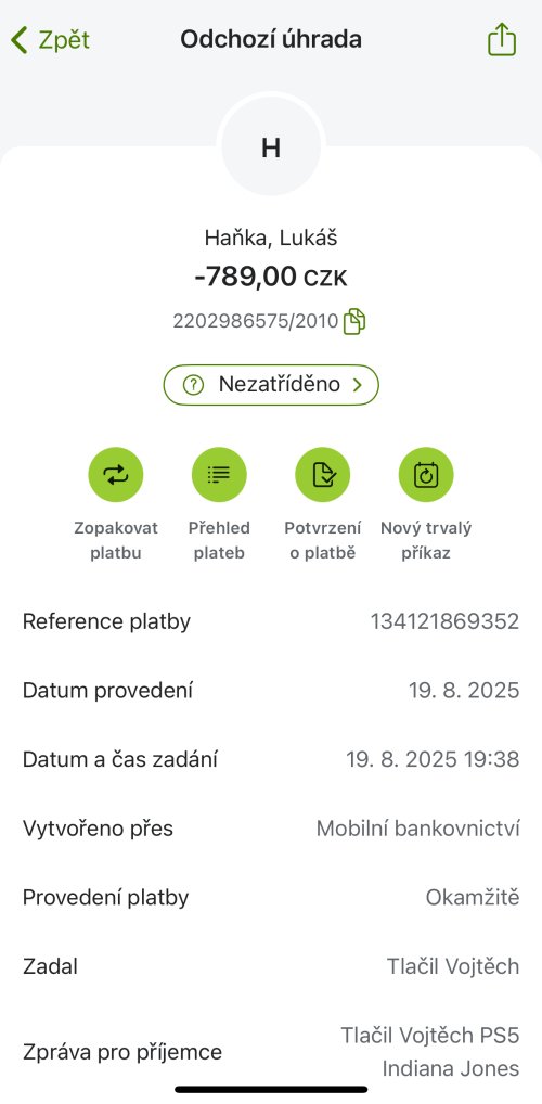 | 20. 08. 2025 | Online přes portál | 43-5877850207/0100 | 450,- | - |